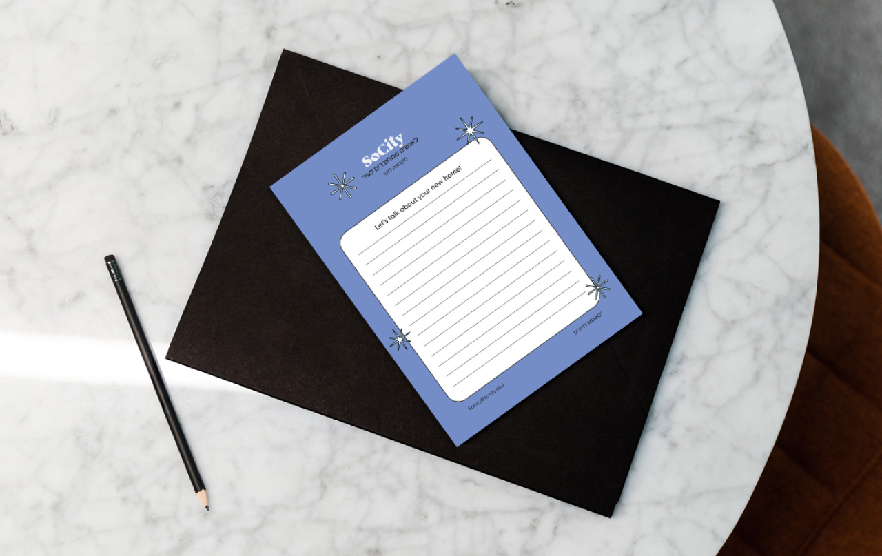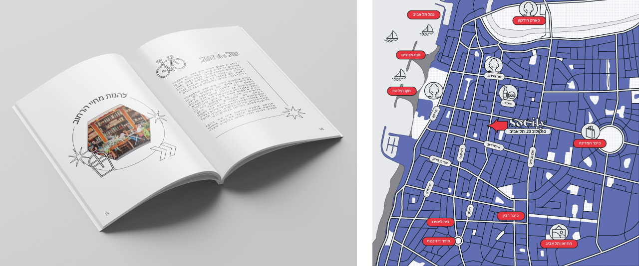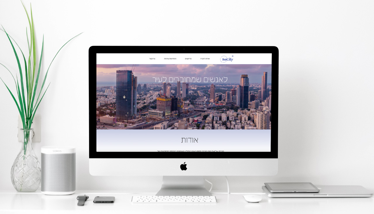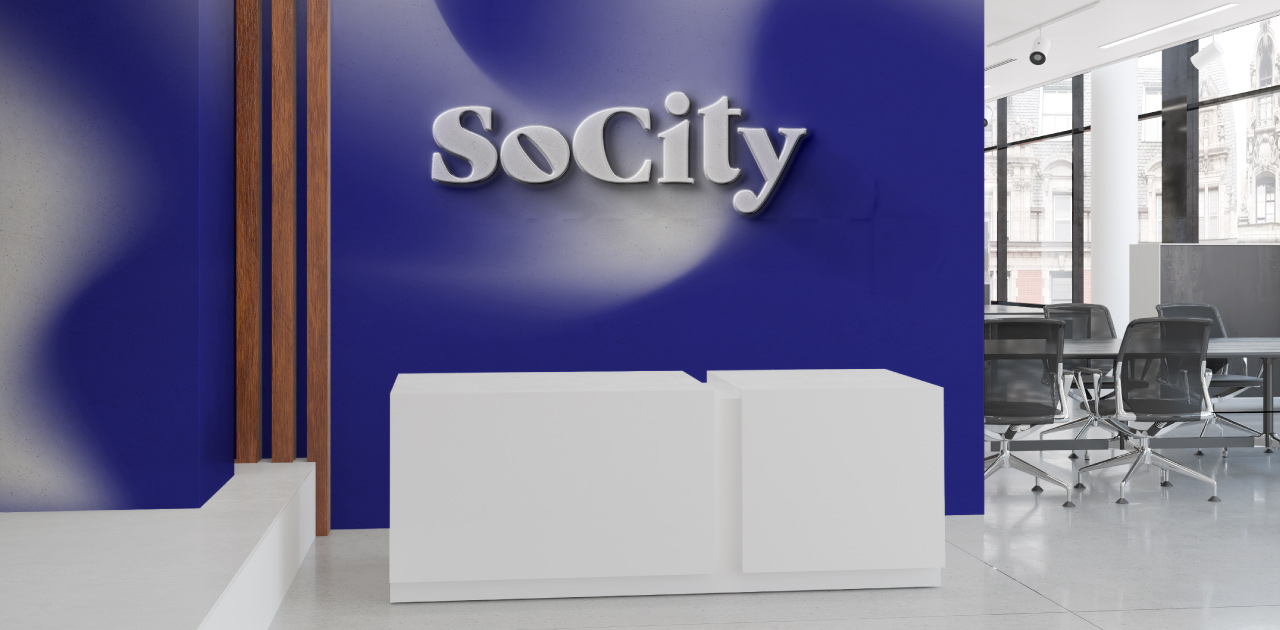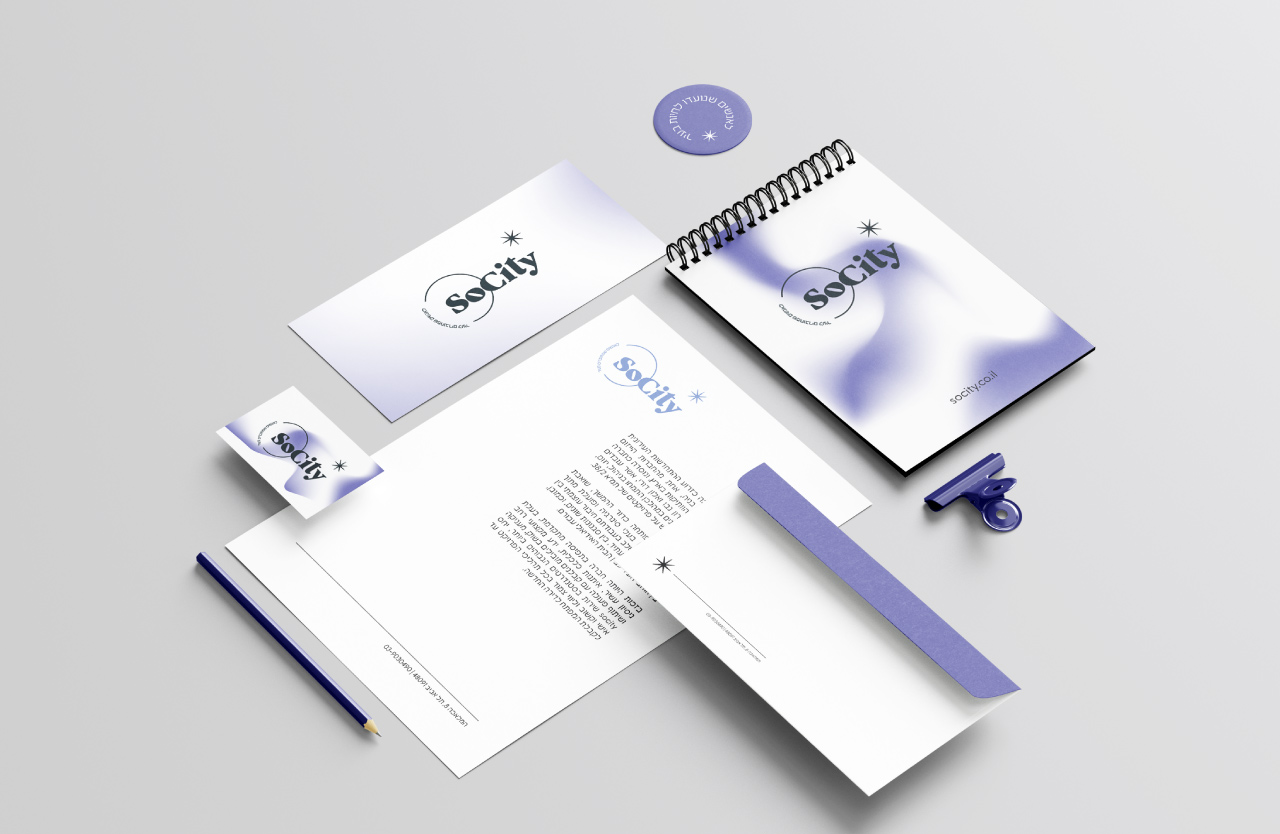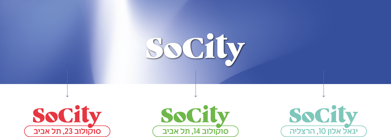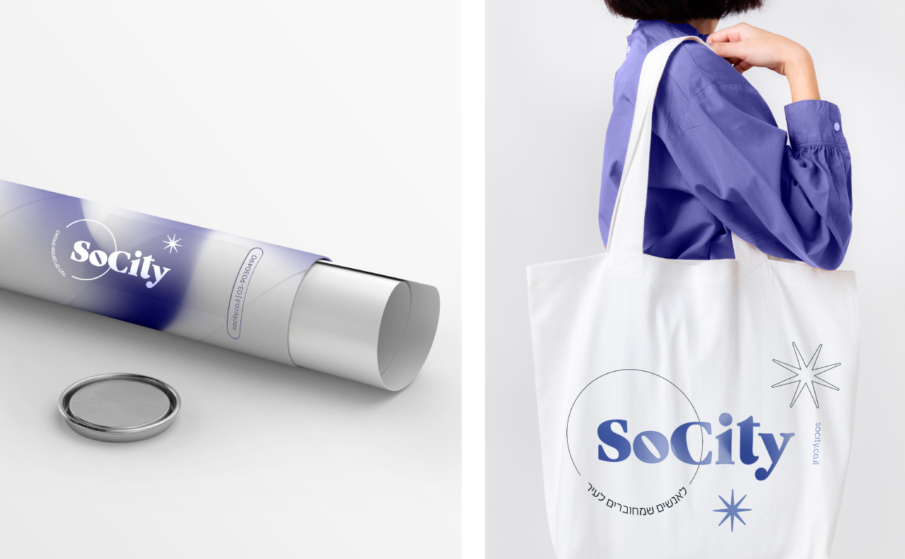 השם שנבחר למותג הוא "SoCity" שמשמעותו ׳כל כך עיר׳, והמצלול שלו בהשראת המילה society המייצגת את אופי החברה ומייסידיה כ׳אנשים של אנשים׳. בנינו עולם ויזואלי שמחבר עולמות צעירים וחדשניים עם עולמות מסורתיים. הלוגו הוא בעל נוכחות עגולה ומזמינה בפונט קלאסי ובחומריות כסופה ויציבה, הגוון המוביל הוא סגול כחלחל. גוון שיש בו גם מהעולם הקלאסי וגם מהעולמות של היום. כל הכלים האלה ״מעורבבים״ לכדי מעברי צבע שובביים המזכירים ספריי גרפיטי. השפה האיקונוגרפית בהשראת ״סטיקרים״ דיגיטלים וצילומים אורבניים חמים המתארים את חיי העיר תל אביב, חתוכים לתוך צורות גיאומטריות כמו באלבומים של פעם. בארכיטקטורת המותג כל פרוייקט מקבל צבעוניות המצטרפת לגוון של המטה ומייצגת משהו מהסיפור המבודל של הלוקיישן.