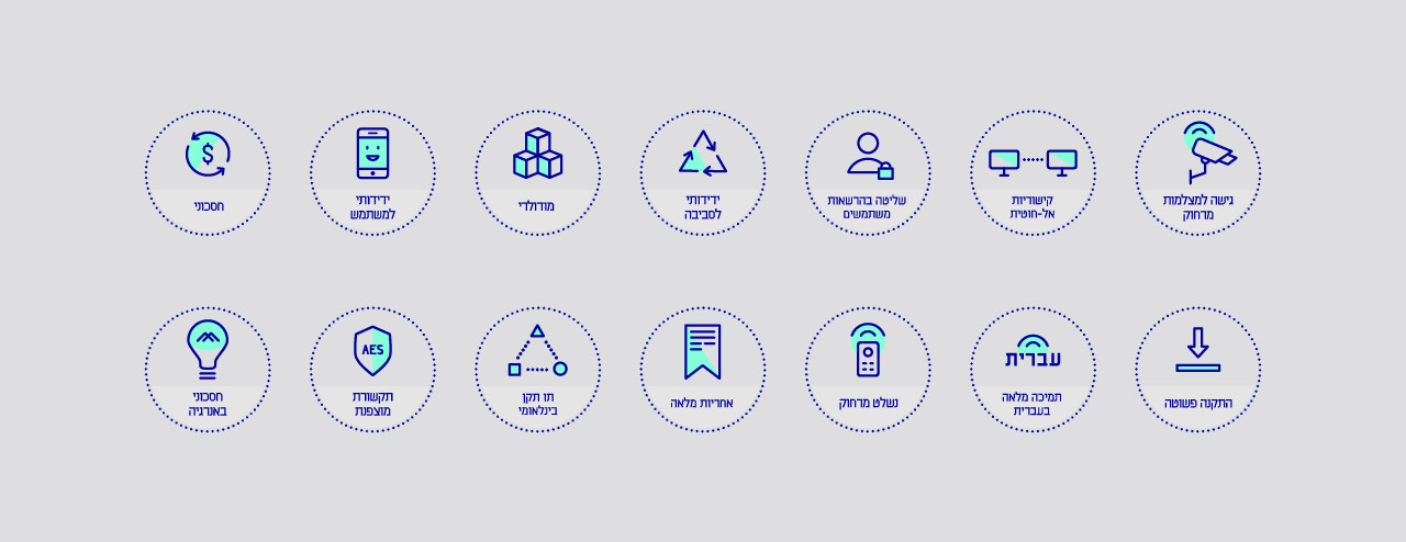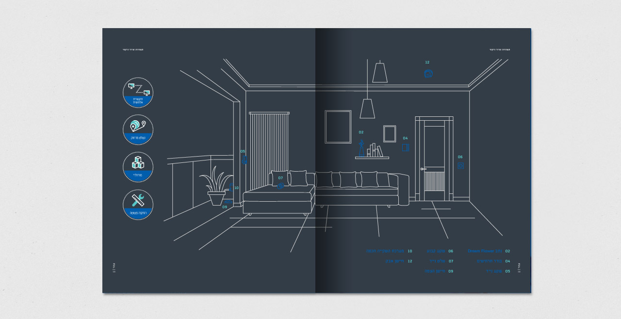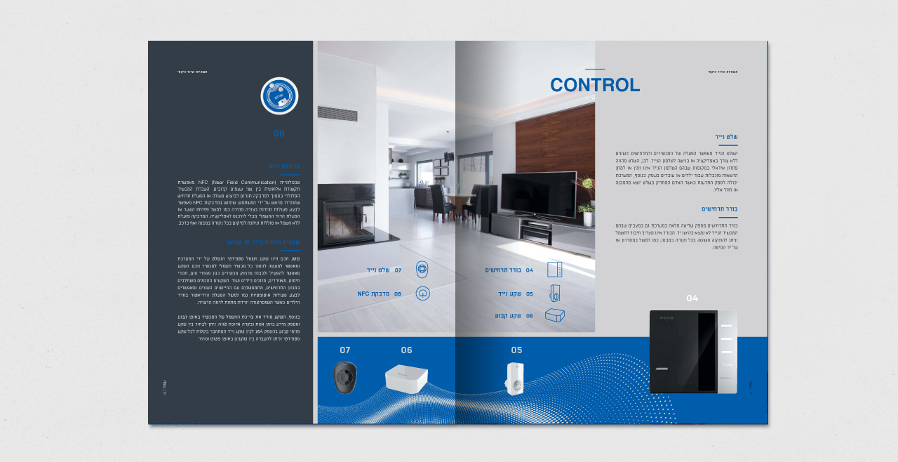 בנוסף, השפה הויזואלית של המותג כוללת טקסטורת נקודות מקומרת המייצגת את הקישוריות בין המוצרים ברחבי החלל ומחברת אותו לאסוציאציות עתידניות. בתוך קטלוג המוצרים שילבנו איורים נקיים עם קוים פשוטים הממחישים את הנוחות והשימוש האינטואיטיבי במוצרים.